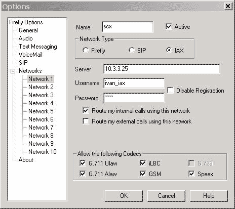 Choose some name for the network, write the IP for the server and the user’s name and password. I choose to name my network ‘scx’ and to register the user ivan_iax which is IAX so I have to check IAX and respectively if the user is SIP registered you have to choose the SIP radio button from ‘Network Type’. My Asterisk server is 10.3.3.25 you must type the IP address of your Asterisk server. The Username I have chosen is ivan_iax and the password must be the same as secret of user ivan_iax in iax.conf. The audio codecs that are selected are checked by default so leave them like this.