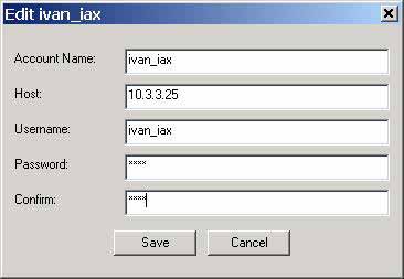 New users are added when you open Options/Accounts/Add. We will add both users we have registered on iax.conf. The first one is ivan_iax. I prefer the account name to be the same as the username. Host IP address must be the IP of your asterisk server (here it is 10.3.3.25 you must type the IP of the asterisk you are using). The password is the same as the secret in the iax.conf where ivan_iax is registered.