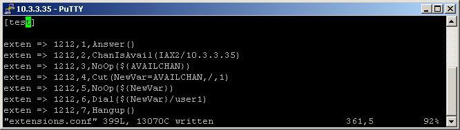 In our example when somebody dials 1212, the call will be answered by the Answer application. The next executed extension will be the one which contains the ChanIsAvail application. It will check whether the set channel is free or not. If the channel is available then it will be set in the ${CHANISAVAIL} variable. In our case the result in the variable will be IAX2/10.3.3.35:4569/3. To find out this we have used the NoOp application.