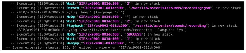 To end the recording press "#". The message is recorded in .gsm format and is called recording.gsm in the /var/lib/asterisk/sounds directory. Asterisk plays back the message after you pressed "#"(after 2 seconds).