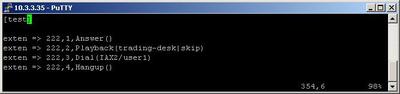 So, in our example when somebody dials 222, the call will be answered by the Answer application. Then the caller will hear the sound file. In our example the caller will hear trading desk. Then the call will be connected to the user user1 through the IAX2 channel.