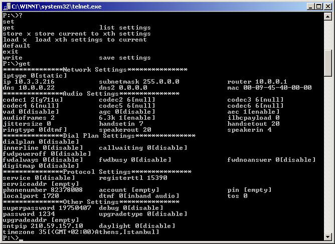 So in order to make a telnet configuration type: telnet 10.3.3.216. We wrote 10.3.3.216 because this is the IP address of our phone. In your case it could be different.