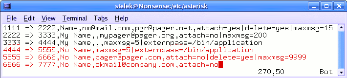 4444 => 5555,No Name,,,maxmsg=5|externpass=/bin/application 5555 => 6666,No Name,,pager@pager.com,attach=no|delete=yes|maxmsg=9999 6666 => 7777,No Name,okmail@company.com,,attach=no