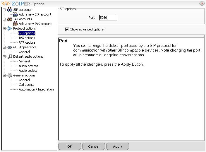 Here You can change the RTP port and also if You have more than one network controler there is a "select-box" in wich You can tell the ZoIPer Softphone wich interface to use (shown by theyr IP addresses):