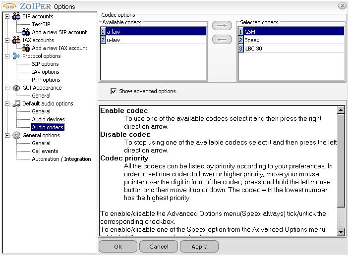 Here You can specify from a list of present codecs which one You like it to use and which not to, and to specify the the order of prefered one over another codec (in the left under the "Avaliable coddecs" is the list of codecs that the ZoIPer have, but are not active and it will not use them, while on the right side under the "Selected codecs" are the one active and the ZoIPer will attempt to negoshiate with them with the VoIP server in order of preference - as they are enumerated from 1 to the count of them, from top to the bottom):