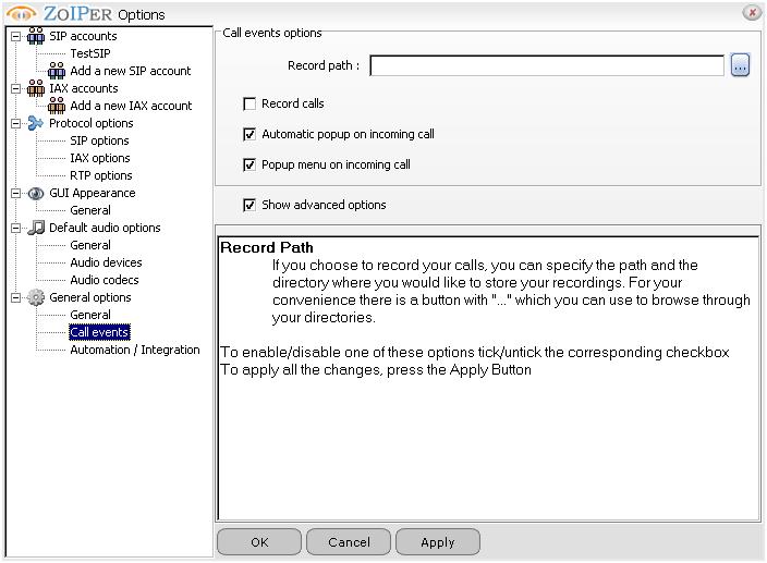 Here You specify should the ZoIPer pop-up on incoming call, also should it record the calls and where to store them: