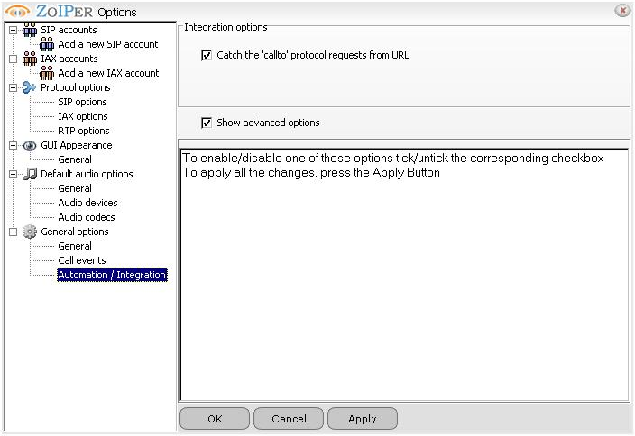 Here You specify the option shoul the ZoIPer respond tho an URL containing "callto" protocol requests: