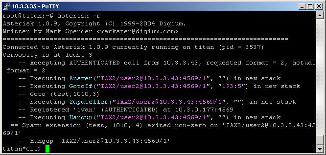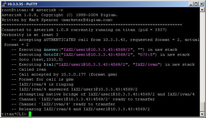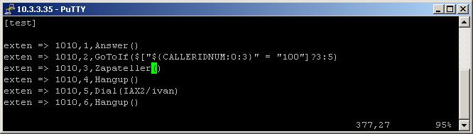 If the first three digits are different from 100, then the call will be redirected to the extension with priority 5. This one will dial the user ivan through the IAX2 channel, thanks to the Dial application.